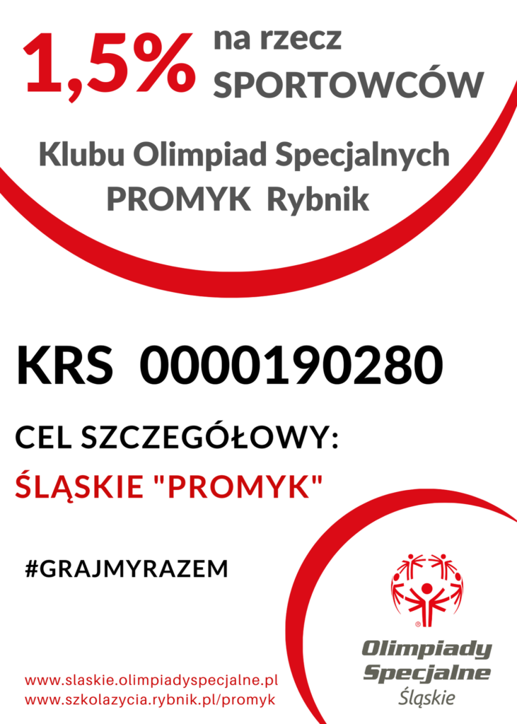 Serdecznie zachęcamy do wsparcia działalności Olimpiad Specjalnych Polska – Śląskie (Klub Olimpiad Specjalnych „Promyk” Rybnik) poprzez przekazanie 1,5% podatku należnego za miniony rok na rzecz naszej organizacji – wpisując do zeznania rocznego w odpowiednie rubryki: